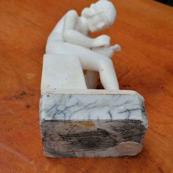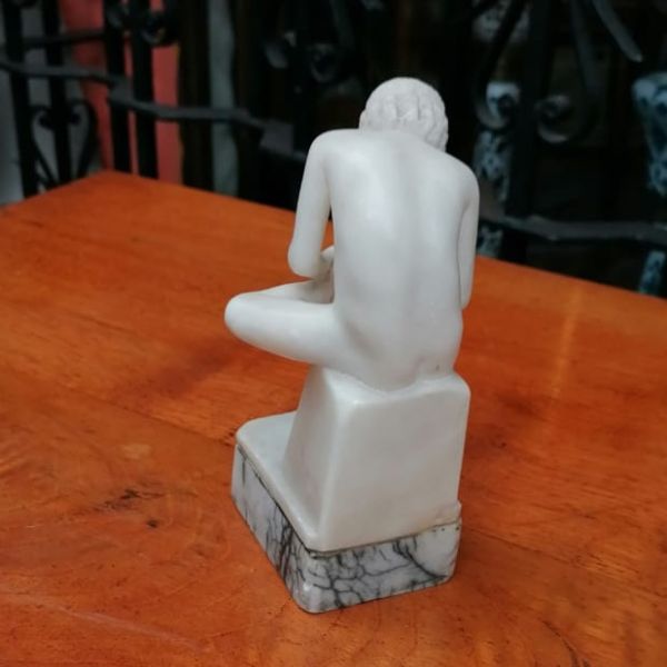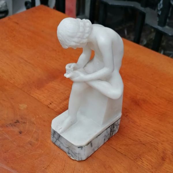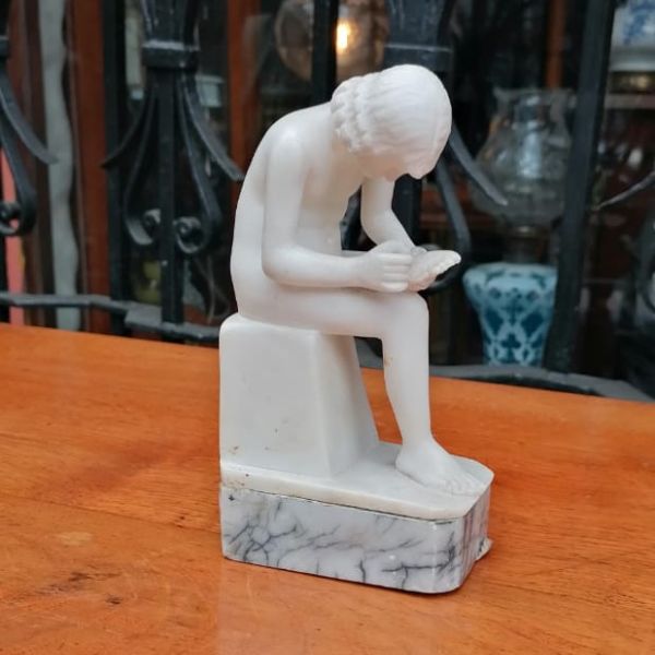 Fina reproducción en mármol natural de la célebre obra clásica “Niño de la Espina” (Spinario), una de las esculturas más emblemáticas de la antigüedad grecorromana. La figura representa a un joven sentado, absorto mientras retira una espina de su pie, símbolo de contemplación y humanidad.