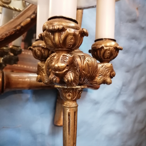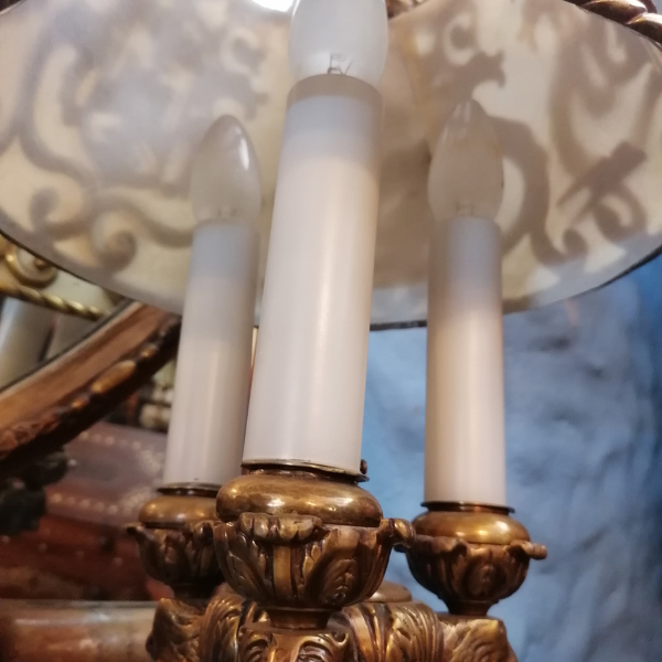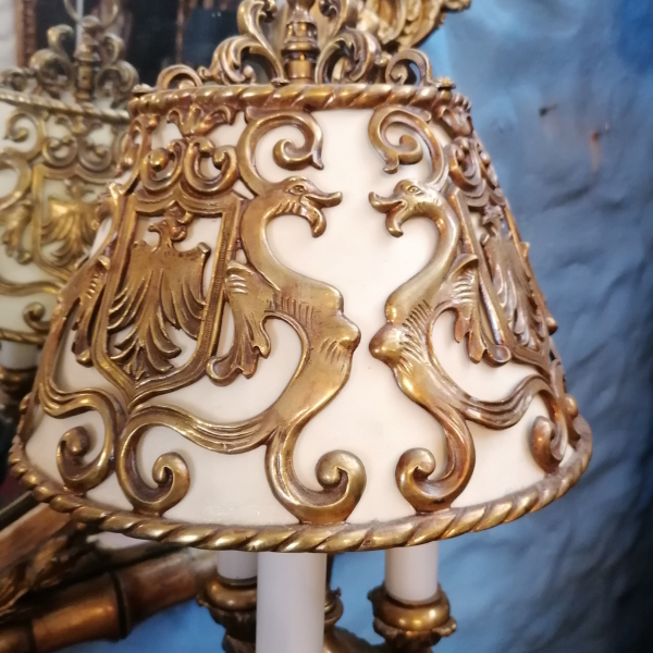 Las formas simétricas, los detalles vegetales y los elementos escultóricos aportan un aire de distinción, ideal para embellecer salones, despachos o espacios con decoración clásica. Esta pieza no solo ilumina, sino que añade carácter y calidez a cualquier ambiente, siendo una verdadera joya decorativa para coleccionistas y amantes de las antigüedades europeas.