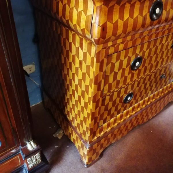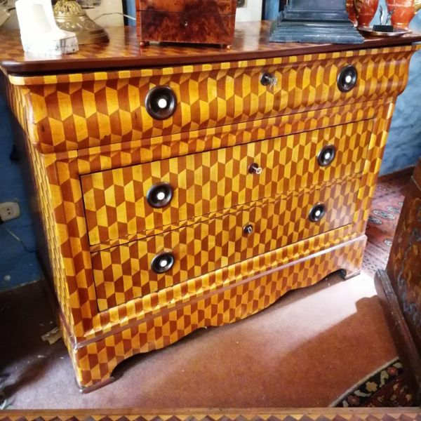 Esta elegante cómoda de tres cajones destaca por su exquisito trabajo de marquetería artesanal, con un diseño geométrico en forma de cubos tridimensionales que aportan profundidad y movimiento visual. Elaborada con diferentes tipos de maderas nobles, combina tonos cálidos y naturales que resaltan su textura y brillo. Los tiradores de madera y madre perla añaden un contraste refinado y un toque de distinción. Las suaves curvas del frente y la base ondulada otorgan equilibrio y armonía al diseño, propio del estilo clásico europeo de finales del siglo XIX. Perfecta para espacios elegantes, salones o dormitorios que valoren la autenticidad y el arte de la ebanistería tradicional.